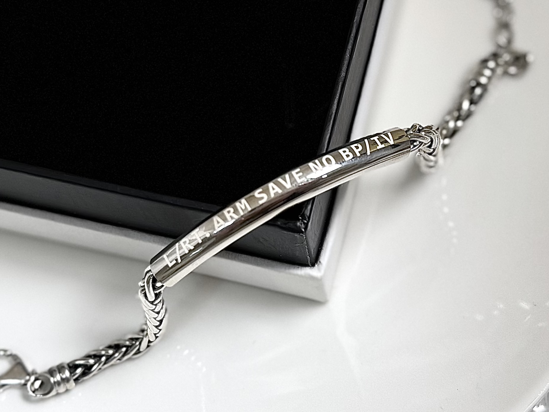 ‘L/RT. ARM SAVE NO BP/IV’ 문구가 각인되어 있어 의료진이 한눈에 확인할 수 있으며,