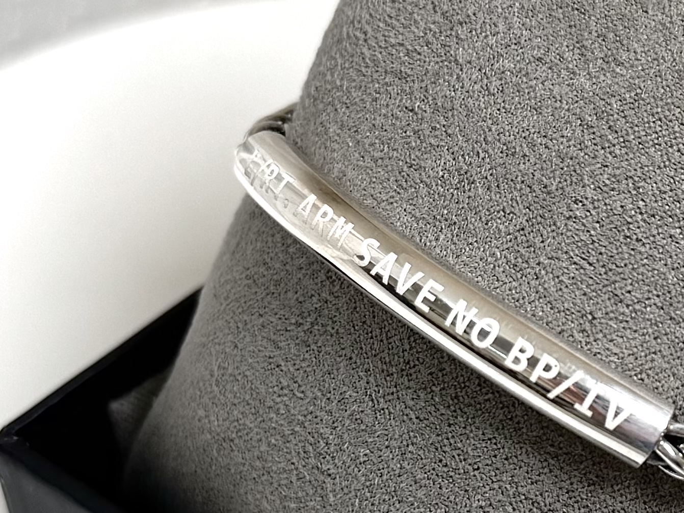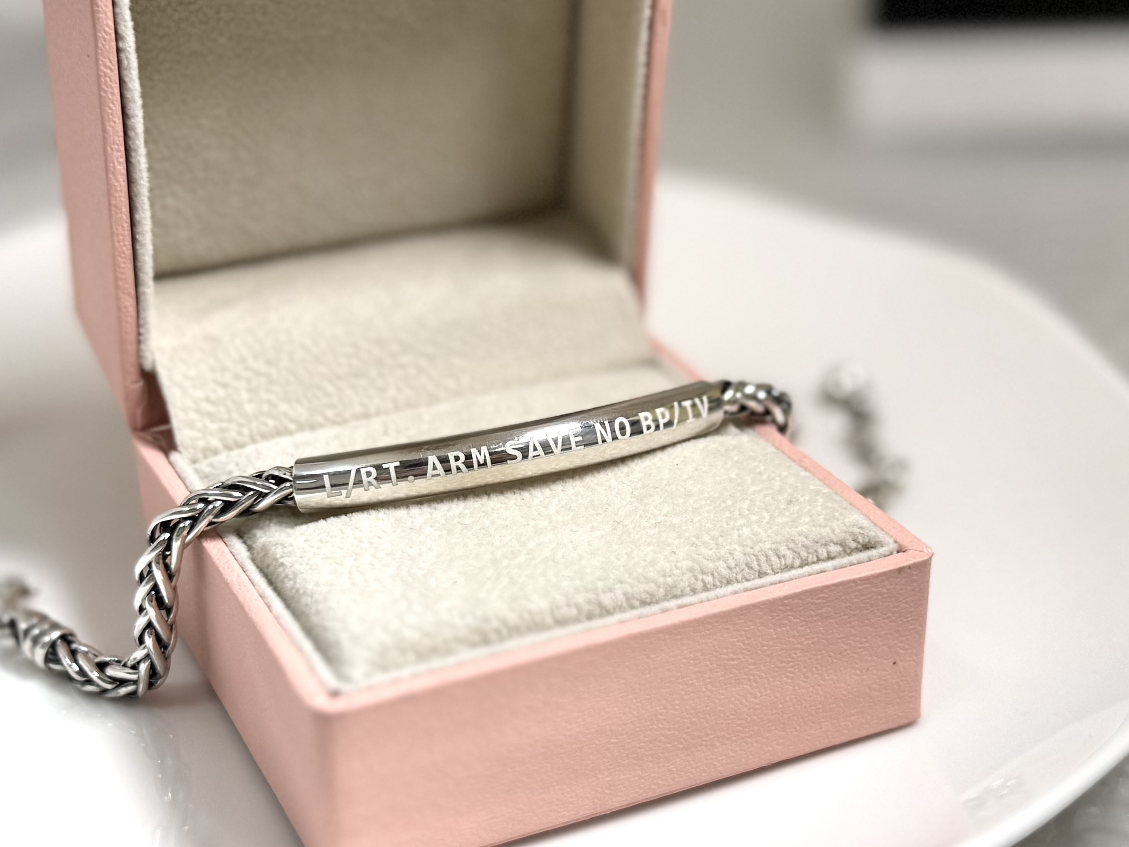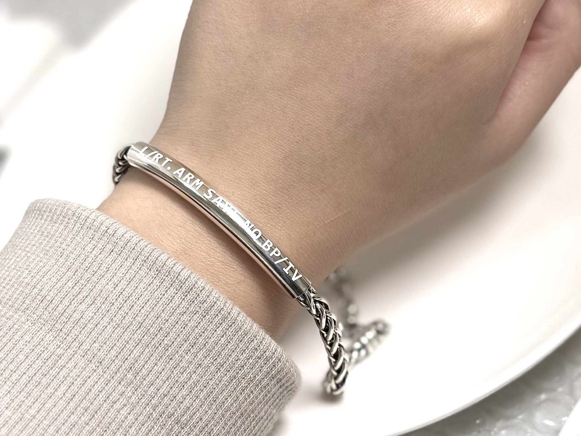 ‘L/RT. ARM SAVE NO BP/IV’ 문구가 각인되어 있어 의료진이 한눈에 확인할 수 있으며,