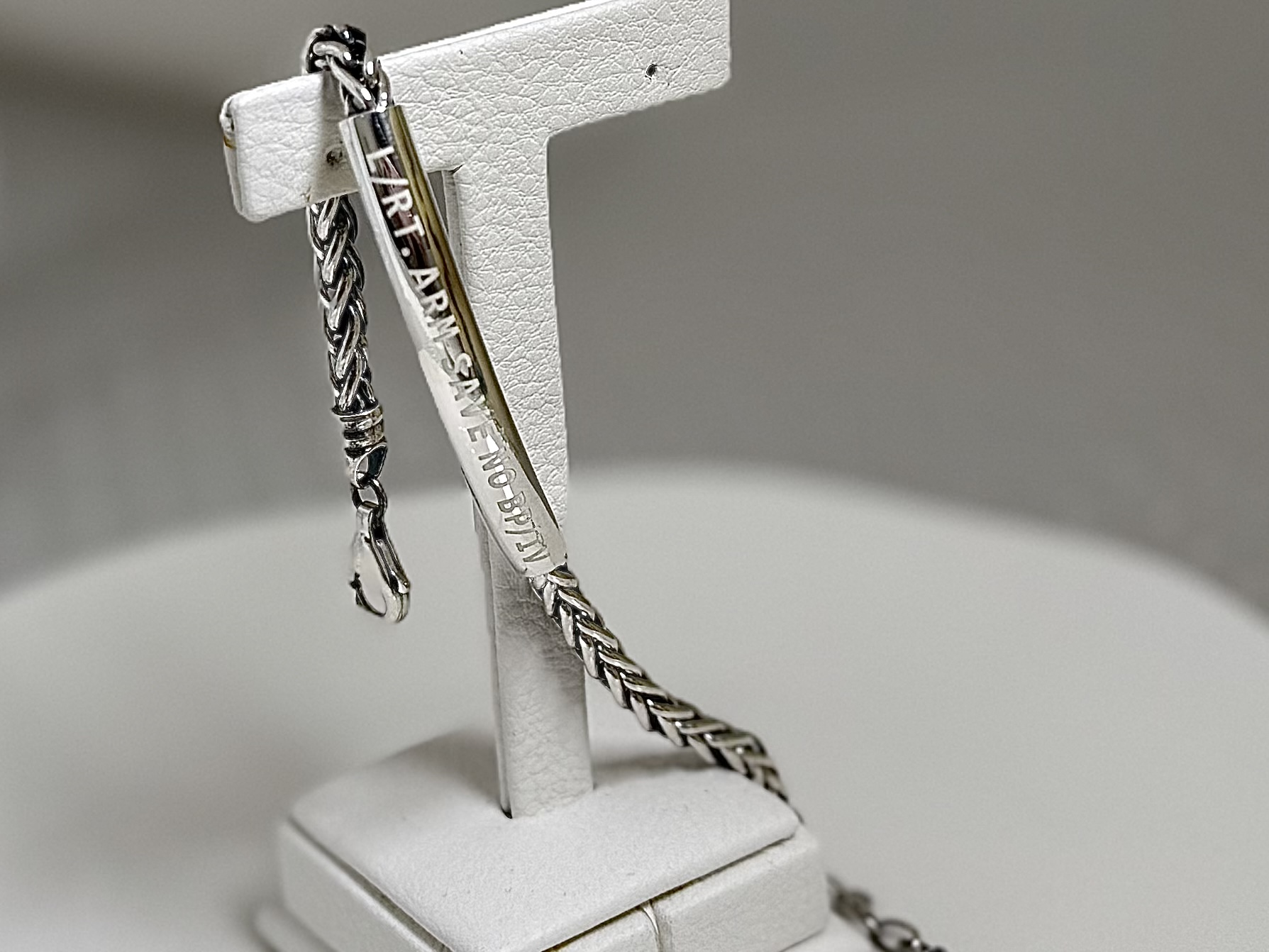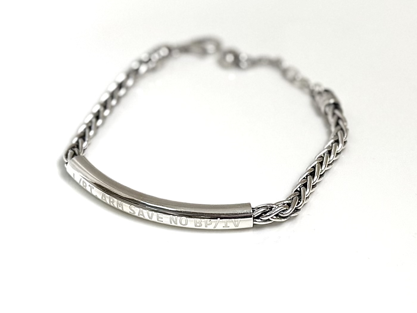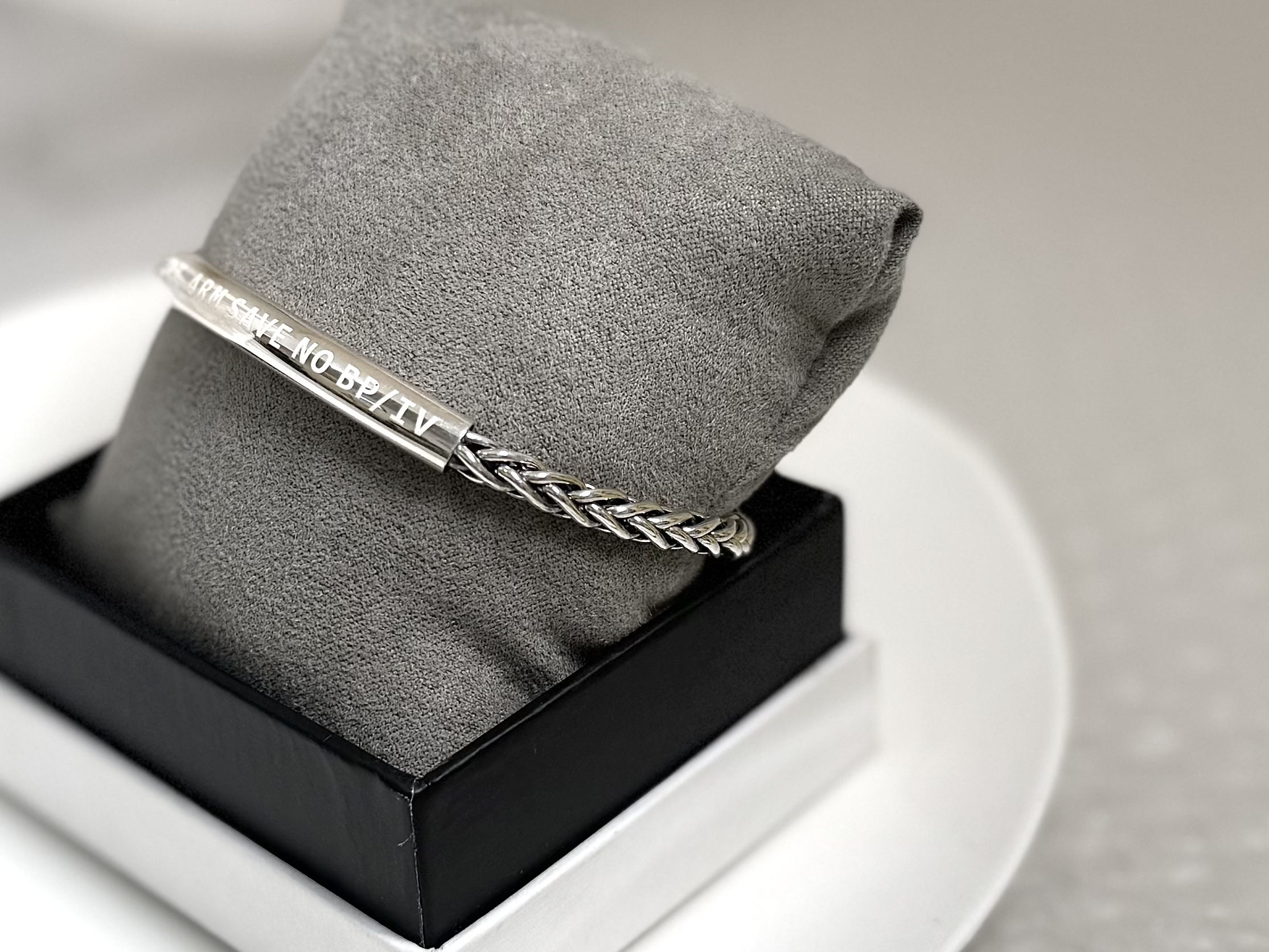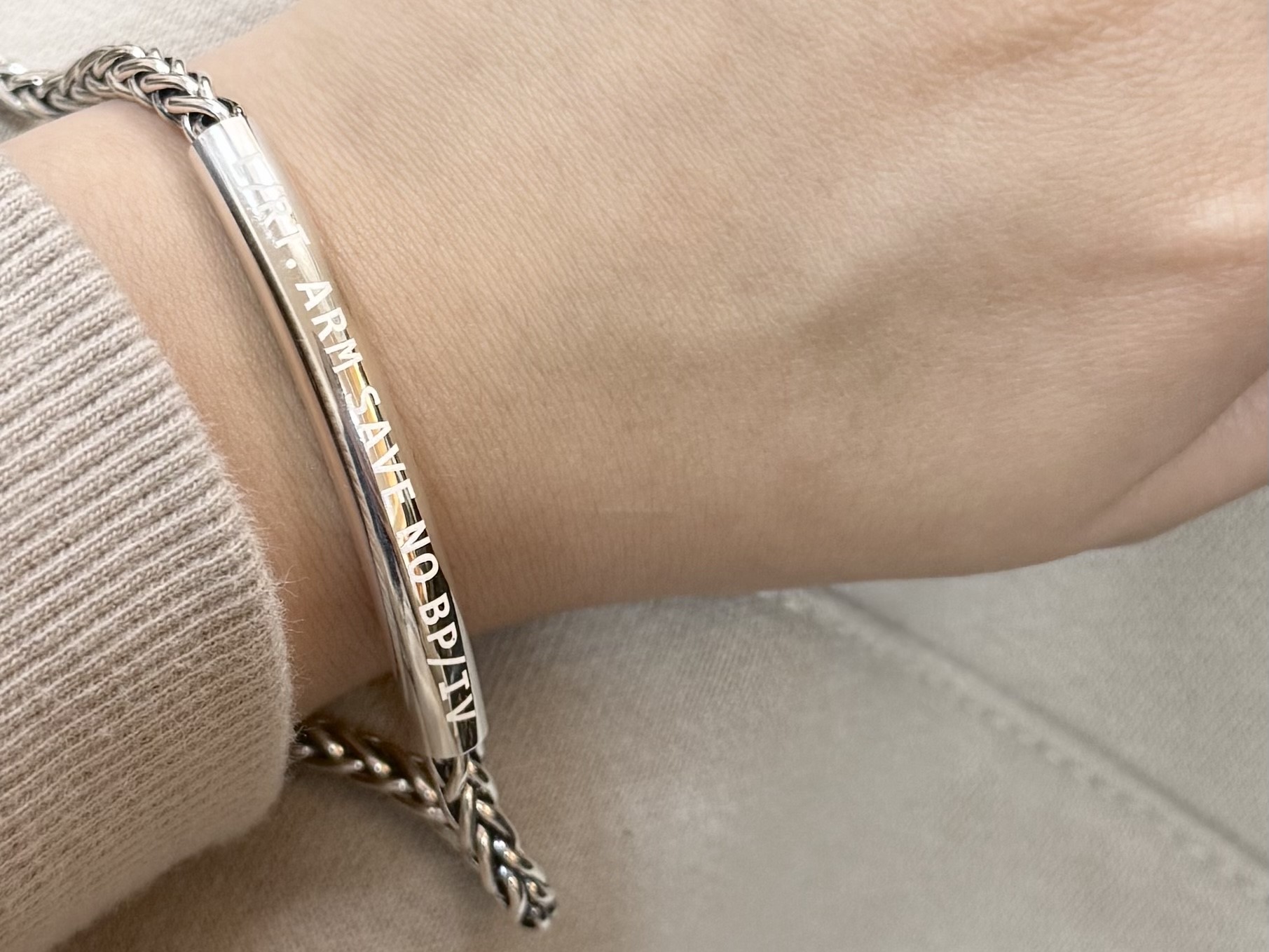 ‘L/RT. ARM SAVE NO BP/IV’ 문구가 각인되어 있어 의료진이 한눈에 확인할 수 있으며,