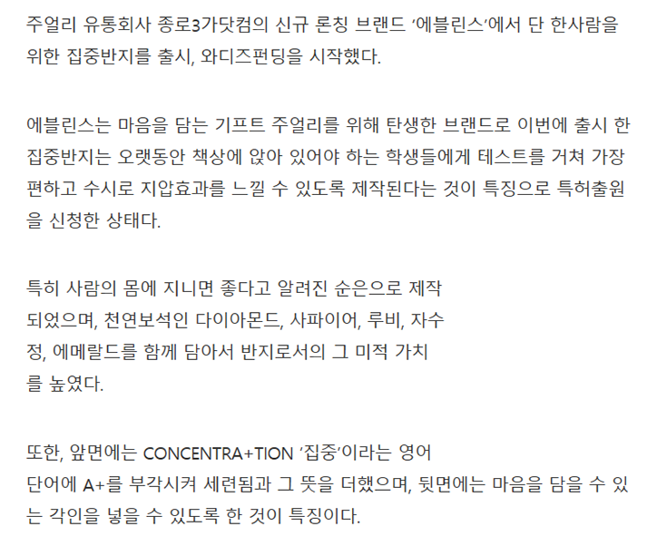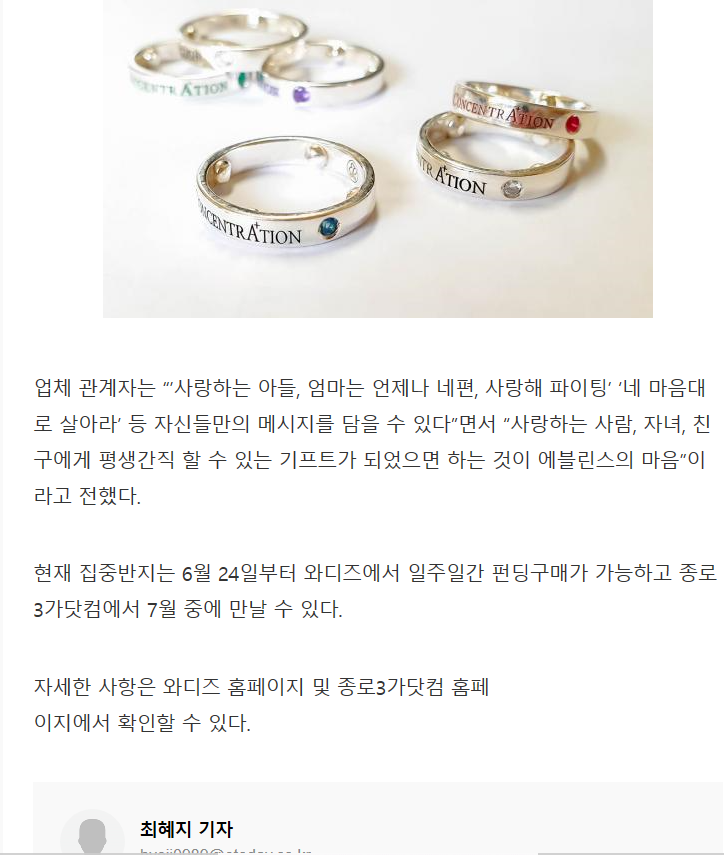 에블린스 집중반지 와디즈 펀딩 인터넷 기사입니다.